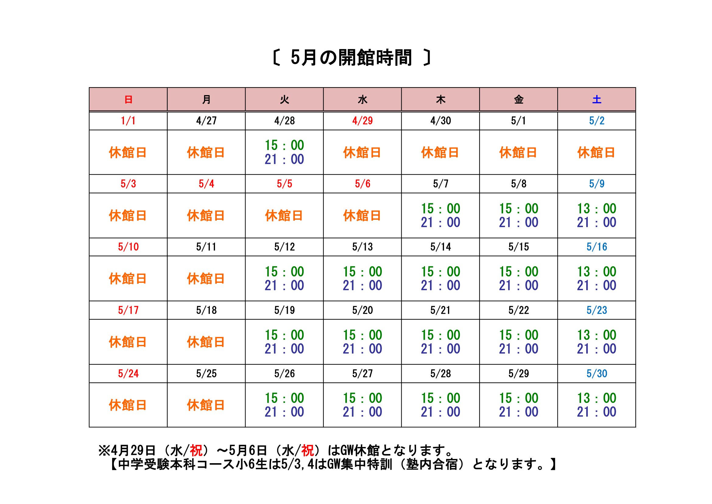 5月4日(月/祝) 8:30~21:00 【ゴールデンウイーク集中特訓は9:00スタート】